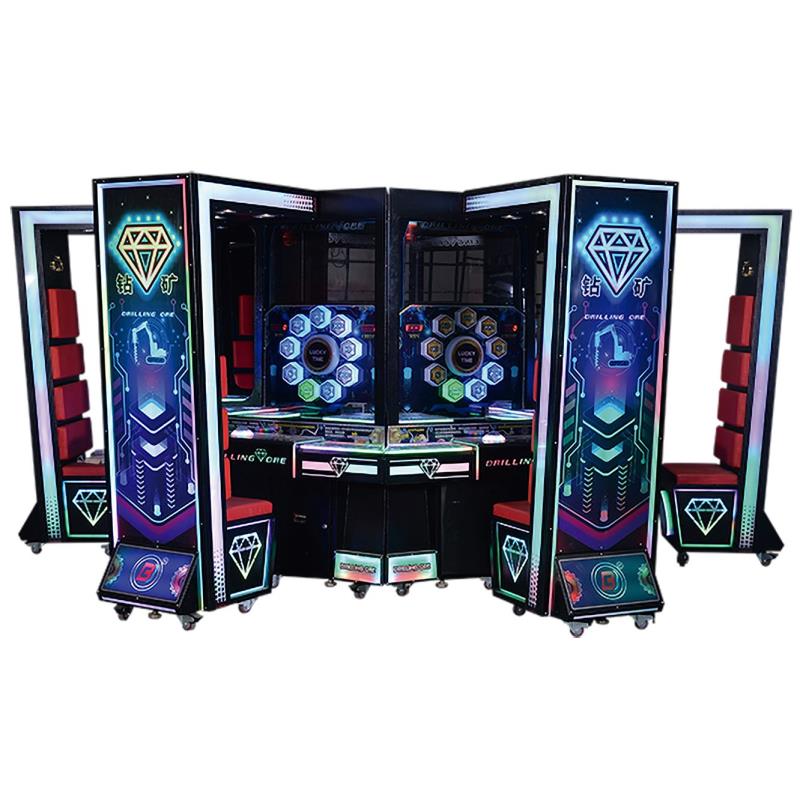 产品介绍:钻矿实物推币机,是一款以电子转灯的方式来获取相应的彩票奖励的场景内容,玩家通过敲击控台按键来启动游戏转盘来获取金币及超级彩票奖励。