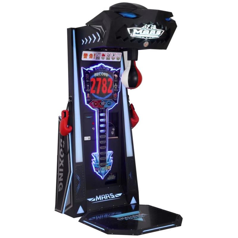 这是一款以拳击为主题的一款游艺机,可自由设置出奖模式,彩票或礼品带上拳靶手套,当拳靶靶心降落时,用力击打拳靶,一共打三拳,然后计分显示板会自动计算出这一拳所使用的力度有多少,从而结束游戏,玩家可挑战最高分。