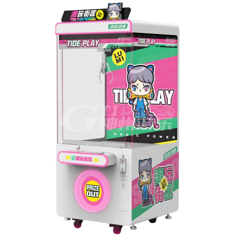 潮玩街区4外观设计主要围绕动漫IP人物设计,机身顶部带有发光人物和发光字体,非常吸引人的眼球,使机器在很远处就能被看到!机身内部有透明的亚克力板,可摆放娃娃手办等礼品,同时控台周围也伴有发光灯条,使得机器更加光彩夺目,吸引玩家的目光。