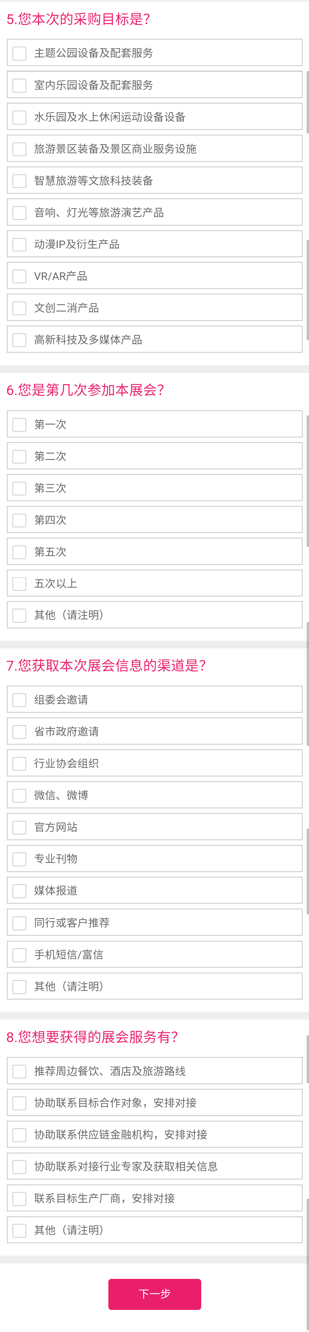 1、登记信息后显示入场二维码,凭该二维码入场,无需换取纸质入场证;2、观众入场同时要出示二维码、粤康码和身份证(或护照)原件;3、观众参观时应佩戴好口罩,在参观过程保持适当社交距离,遵从现场防疫安排。2、2020中国文化产品国际营销年会之中国室内乐园发展大会4、2020中山文旅产业投融资对接会暨金融助力文旅发展论坛6、全国索道与游乐设施标准化技术委员会“宣贯会议” 1、将召开新闻发布会,通过全球媒体发布展会信息,扩大博览会在境内外的影响力;2、将通过300多家专业媒体、大众媒体、自媒体、网络媒体、新媒体宣传报导博览会;3、将成立国际国内呼叫中心,对50万观众数据库持续呼叫,并发送不少于2000万条富信/短信;4、将寄送20万张参观券/请柬、2万份邀请函,参加相关展会派发请柬,直接邀请专业采购商到会;5、将由中国文化娱乐行业协会、中国游艺机游乐园协会、中国旅游景区协会以及各省市景区、旅游协会等主办、协办和支持单位共同组团参展参观。广东鸿威国际会展集团有限公司/中山市锦鸿展览服务有限公司地 址:中山市港口镇恒丰六路6号广东游戏游艺文化产业城3号幢一单元4楼