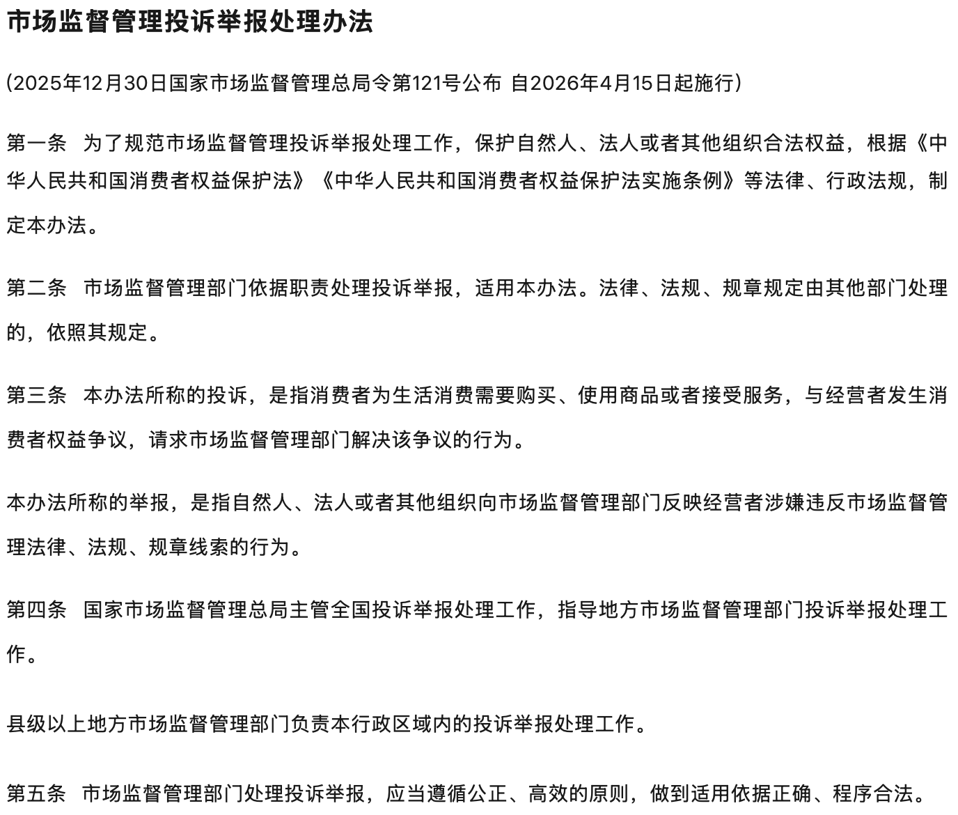 | 《办法》自2026年4月15日起施行,原《市场监督管理投诉举报处理暂行办法》同时废止。 |