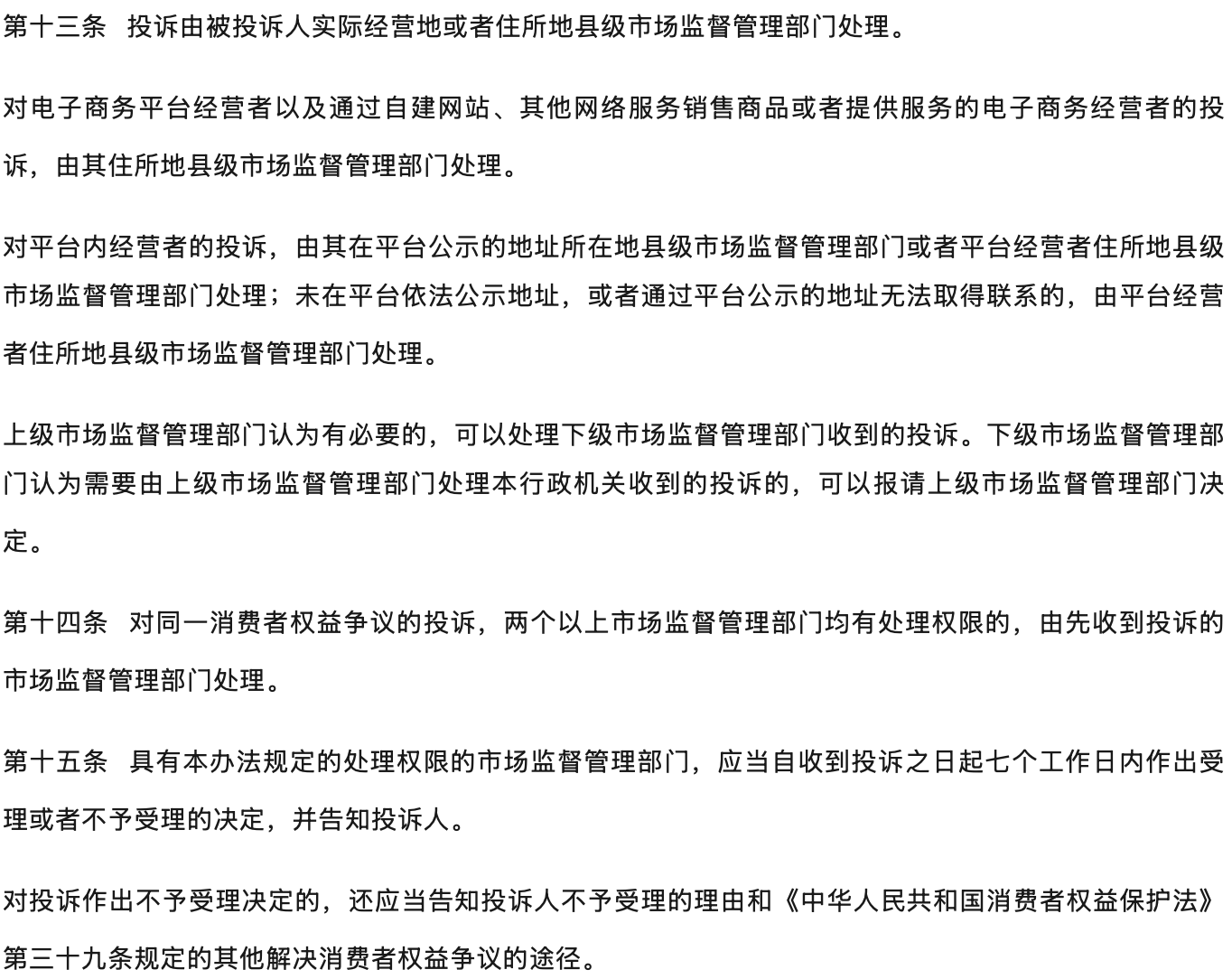 | 优化投诉管辖,压实平台责任。针对部分网店身份信息不真实、平台协助解决争议不到位等问题,新增规定平台内经营者未在平台依法公示地址,或者通过平台公示的地址无法取得联系的,由平台经营者住所地处理投诉,以更好落实平台主体责任和属地监管责任。 |