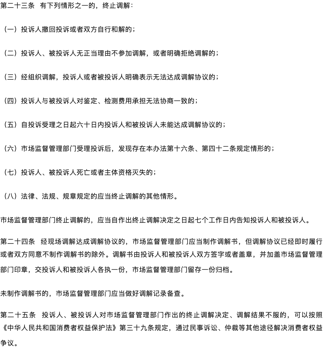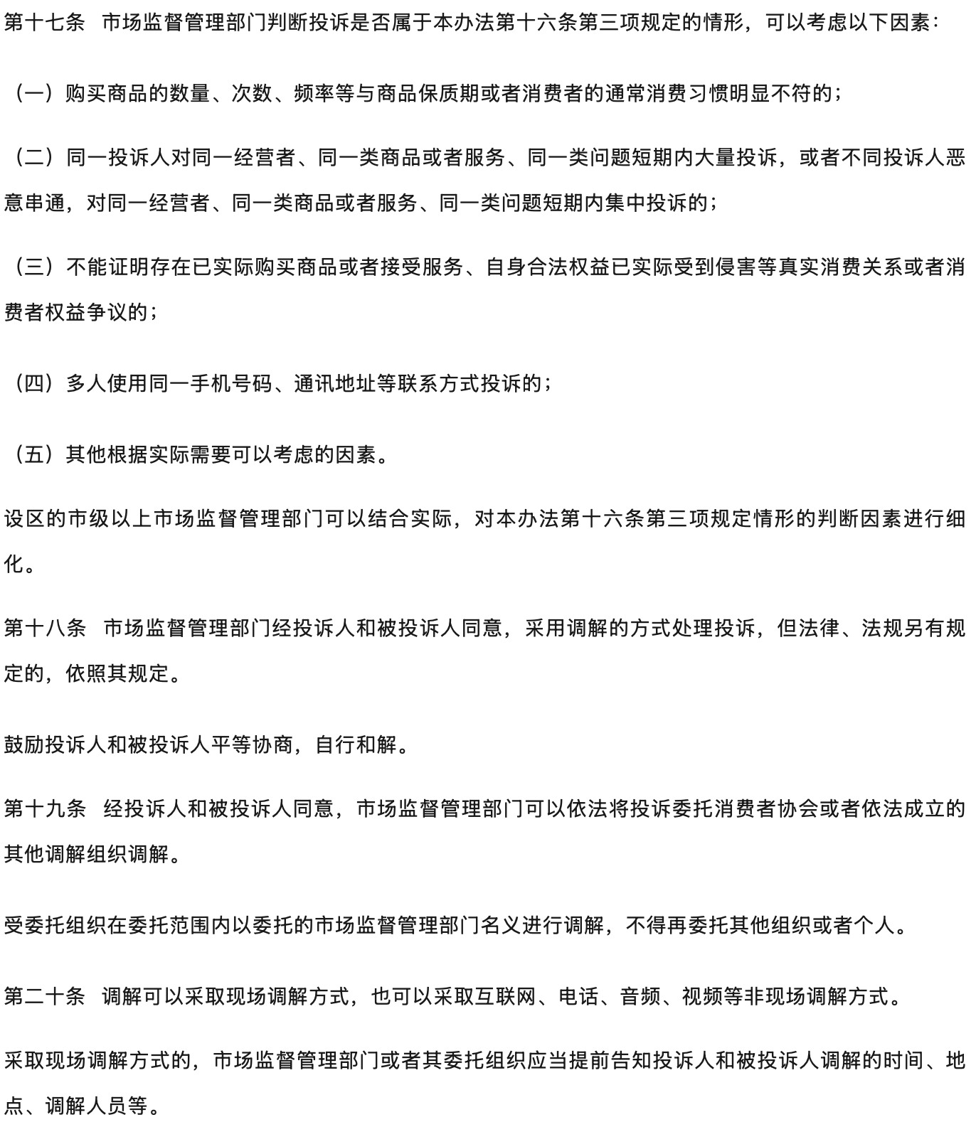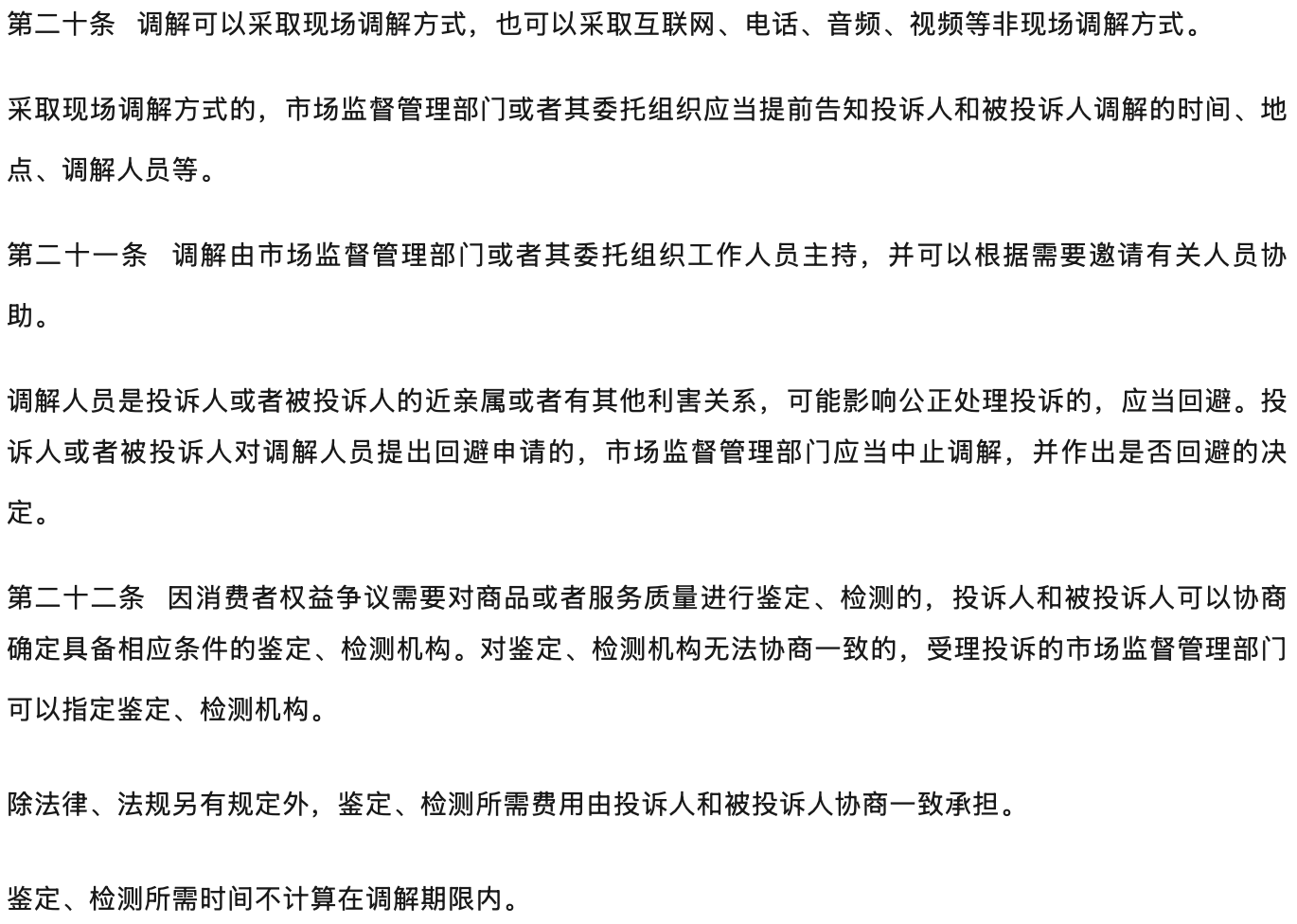 | 强化权益保护,推动纠纷化解。完善行政调解程序,对投诉不予受理的告知、鉴定检测程序、委托调解、调解期限、调解的救济等作了增补修改;新增投诉处理的回访问效要求;新增规定开展消费预警和风险提示,引导经营者通过消费维权服务站、首问负责、先行赔付、在线争议解决等机制预防和解决消费者权益争议,推动消费环境源头治理。 |