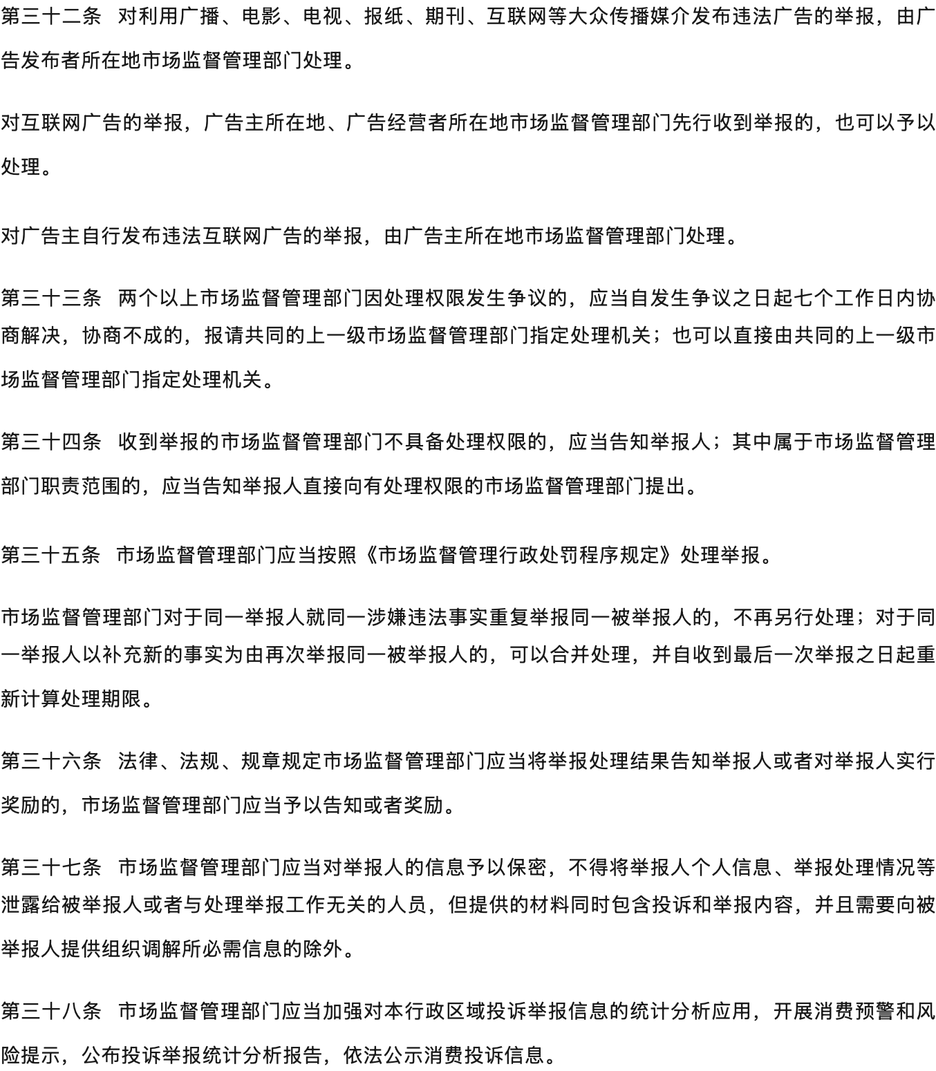 | 优化举报程序,提高处理效能。完善举报的形式要件,提高举报的真实性和有效性;新增规定重复举报的不予处理和并案处理机制,优化举报告知程序,提高基层行政效率;删除广告领域的举报移送程序,强化同案管辖;明确统一通过全国12315平台处理,加强大数据分析应用。 |