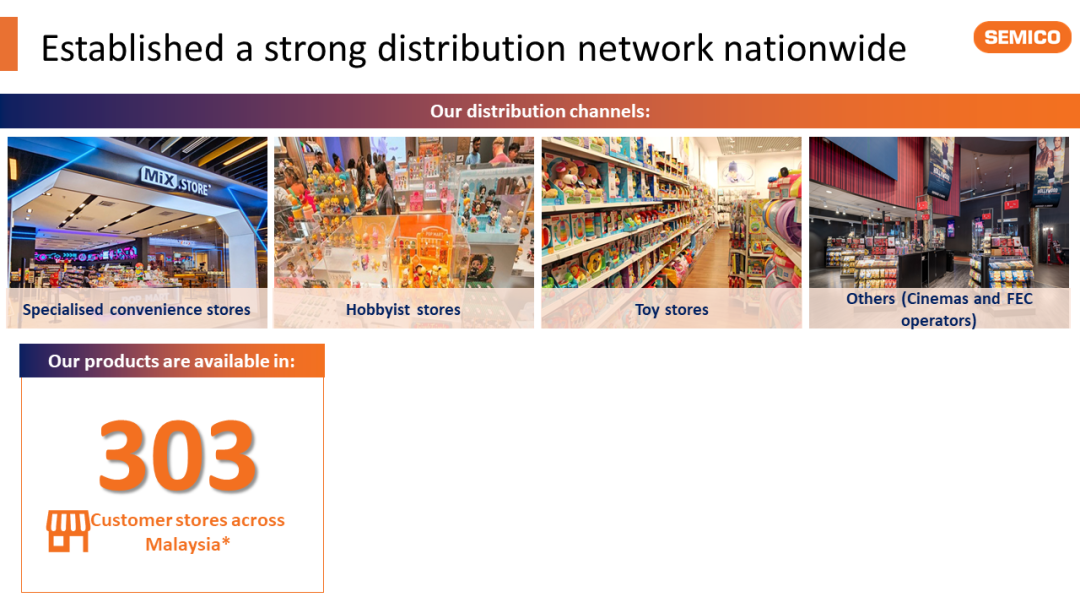 | 目前Semico在马来西亚的玩具潮玩分销门店数超300家,覆盖MiX.STORE等进口零食专卖店、潮玩店、影院和家庭游乐中心等多种业态,使其成为马来西亚潮玩生态的重要节点。 |