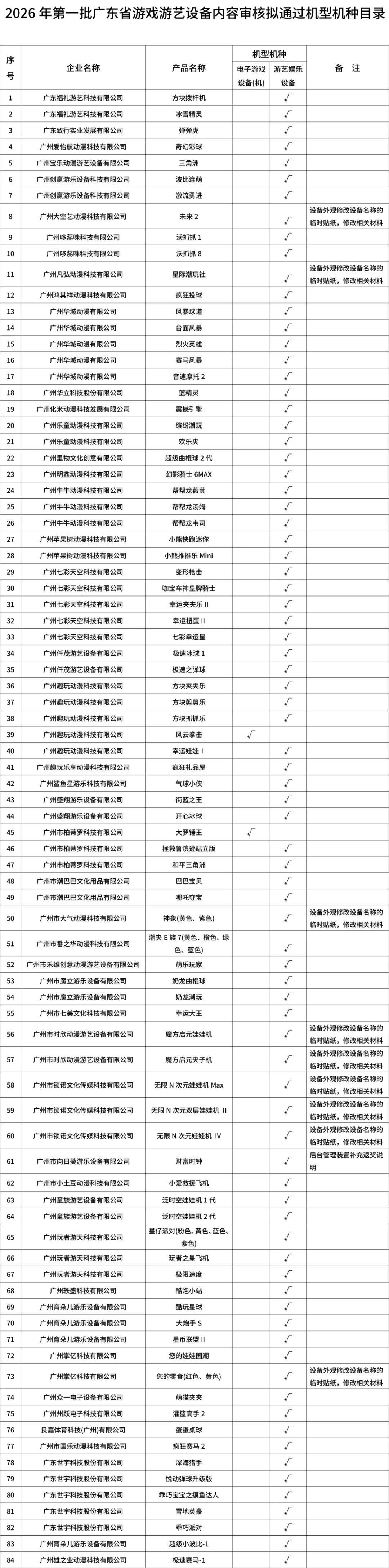 | 广东省文化和旅游厅关于发布《2026年第一批广东省游戏游艺设备内容审核拟通过机型机种目录》的公示 |