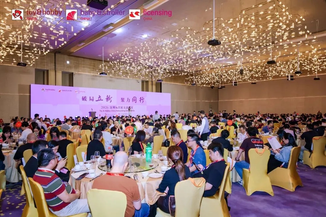 | 当晚,主办方在希尔顿酒店2楼招华宴会厅举办以“破局立新 聚力同行”为主题的“2026深圳玩具展交流晚宴”,国内外数百位行业精英齐聚一堂,交流碰撞,共绘行业新篇。 |