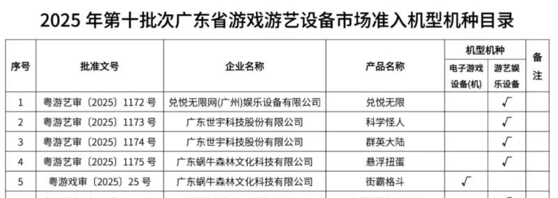广东文旅厅公示《2025年第十批广东省游戏游艺设备内容审核拟通过机型机种目录》