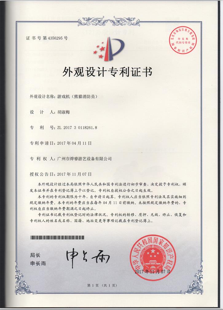 外观设计专利证书-熊猫消防员