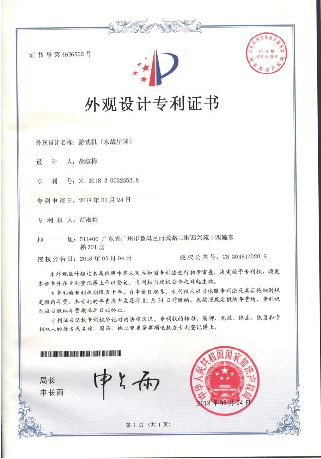 外观设计专利证书-水战星球