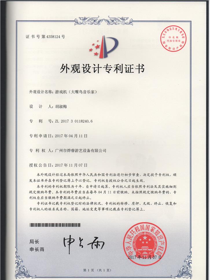 外观设计专利证书-大嘴鸟音乐家