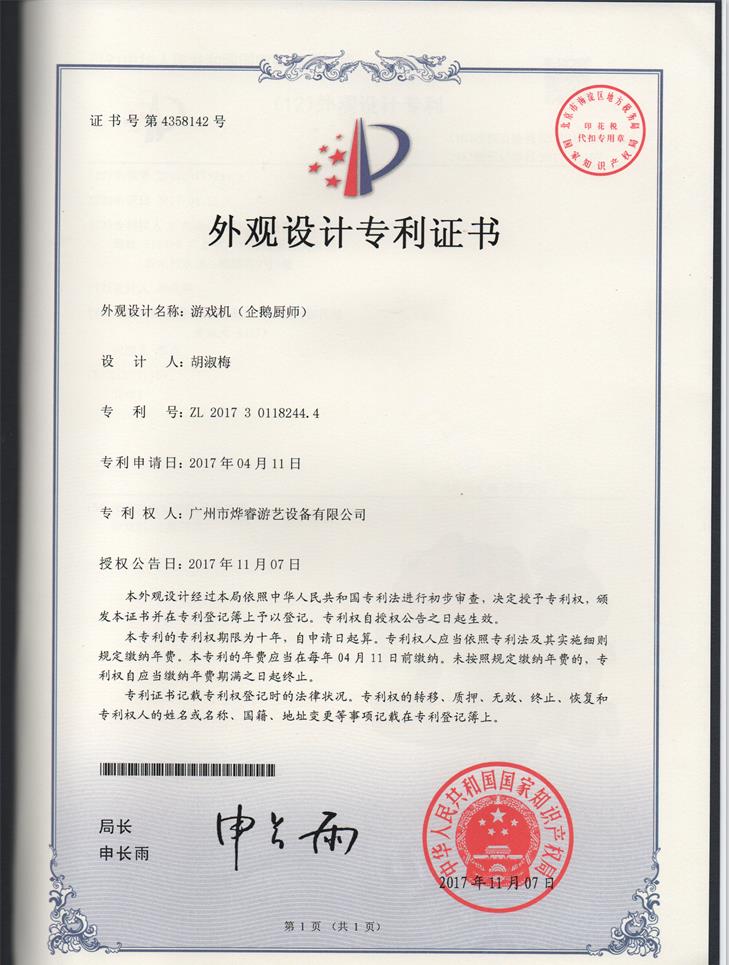外观设计专利证书-企鹅厨师